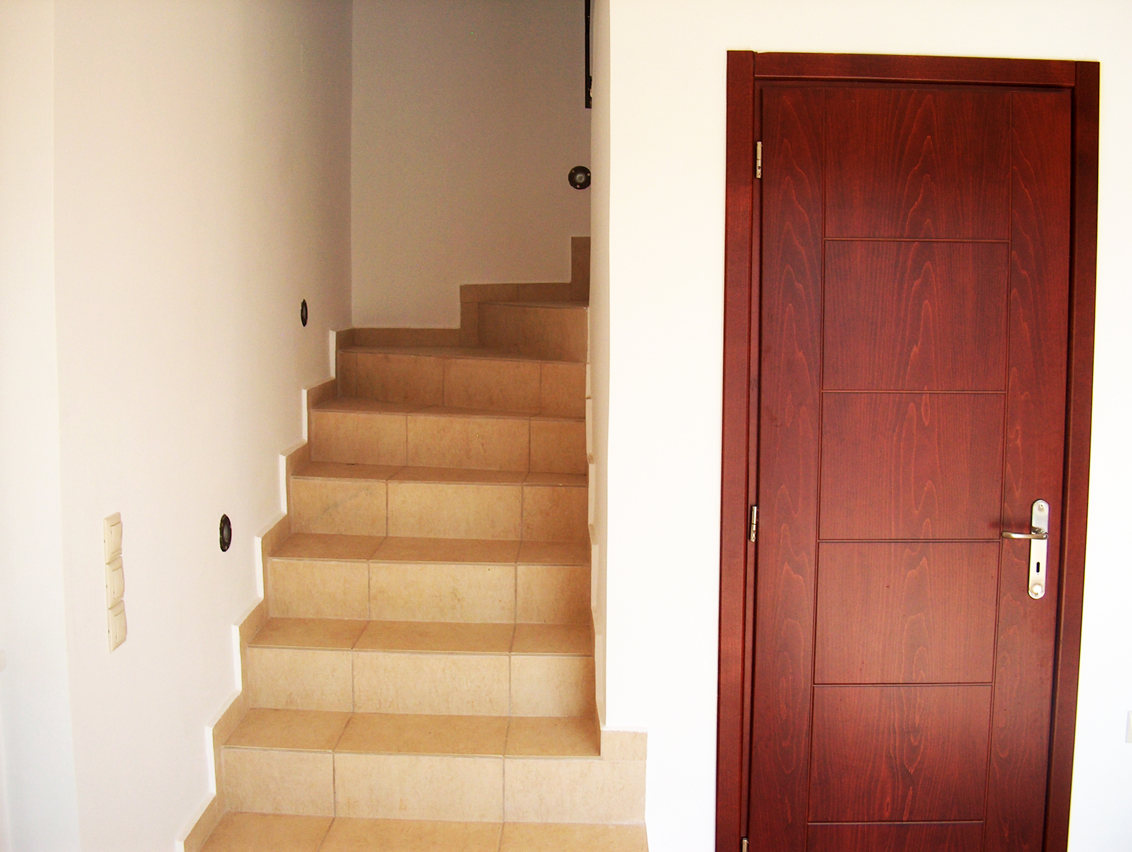 Μπαίνοντας στο εσωτερικό της οικίας βρίσκουμε ένα ενιαίο χώρο με σαλόνι, τραπεζαρία, κουζίνα και ένα wc. Το σαλόνι έχει μία δίφυλλη πόρτα που οδηγεί στην βεράντα και στην πισίνα. Με μία εσωτερική σκάλα, ανεβαίνουμε στον επάνω όροφο, οπού υπάρχει ένα μπάνιο με μπανιέρα και τρία υπνοδωμάτια με ξύλινες ντουλάπες. Τα υπνοδωμάτια διαθέτουν κλιματισμό και μπαλκονόπορτες που οδηγούν σε εξώστες με πανοραμική θέα στα Λευκά Όρη καθώς και στον κήπο και την πισίνα.